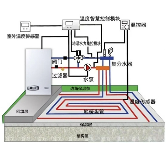 地暖系统的主材和辅材是构成地暖系统的关键材料,两者的分工不同,共同保障地暖系统的性能和长期使用效果,下面是地暖系统各个部分讲解图: