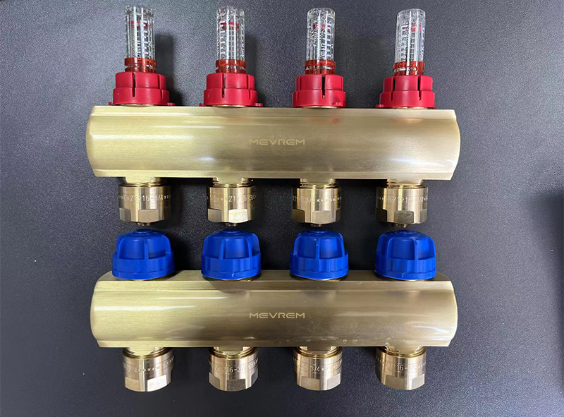 (3)分集水器:分集水器在地暖系统中主要负责地暖环路中水流量的开启和关闭,相当于地暖系统的心脏,整个地暖系统中的热水靠分集水器均匀的分配到各个支路里,在地暖管内循环后汇集到一起,在水泵水力的作用下在进行分配,保证整个采暖系统的正常运行。